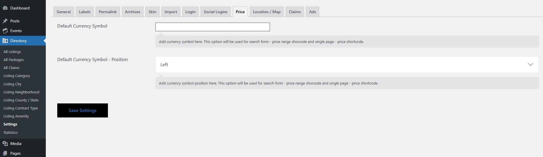 Navigate to **WordPress Dashboard → Directory → Settings → Price** to configure price-related options.