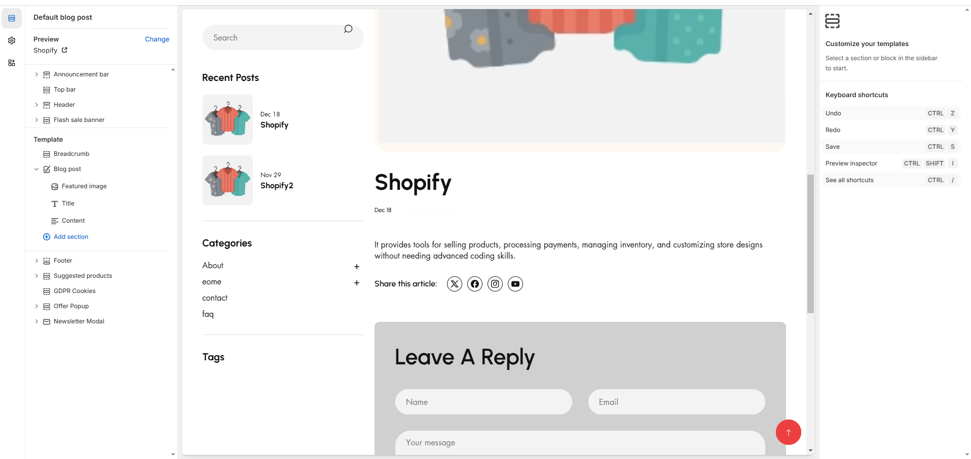 * The **Recent Articles** section in a Shopify blog displays the latest published blog posts. It helps improve engagement by showing fresh content to visitors.&#x20;