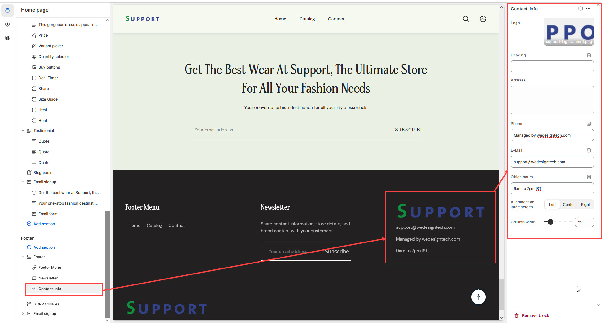 The **Contact Info Block** in the Footer Section allows you to display your store’s **address, phone number, email, and office hours**, making it easy for customers to get in touch with you.