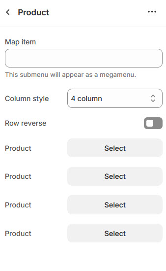 Each column can display a **single product**, allowing up to **4 featured products** in the megamenu.