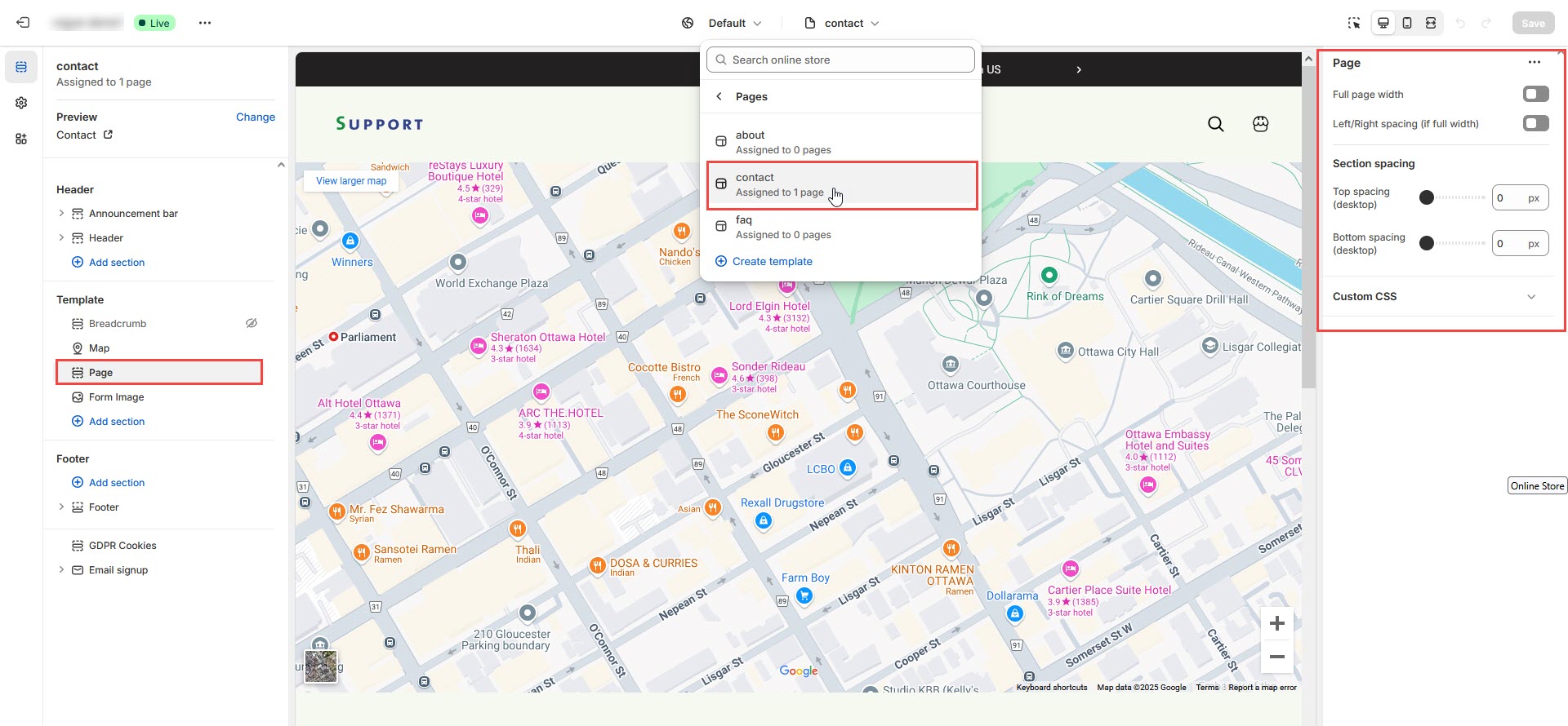 **Step 4 :** Select the **Contact** template from the **Theme template** drop-down menu in the **Online Store** sectio&#x6E;**.**