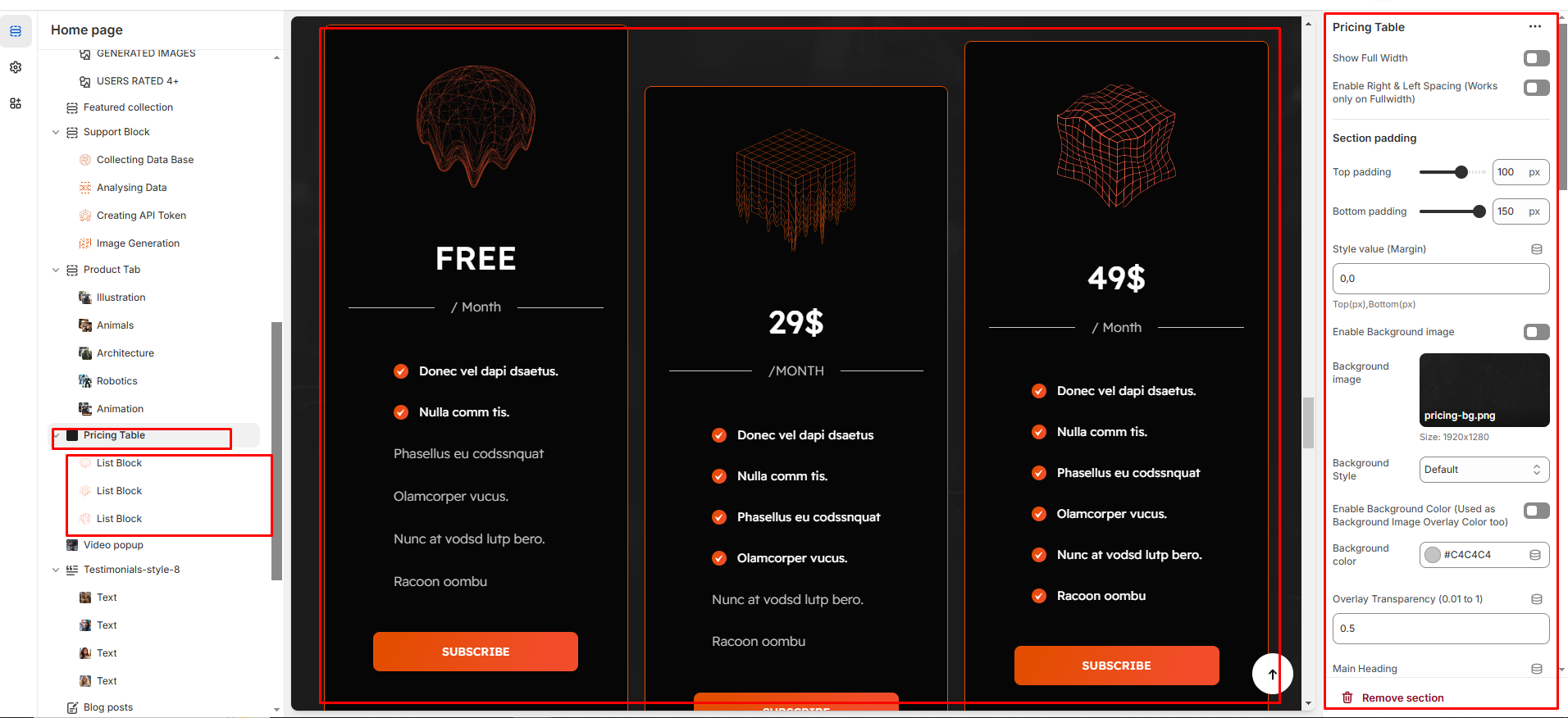 * Click Add section and search for Pricing Table (if available in your theme).