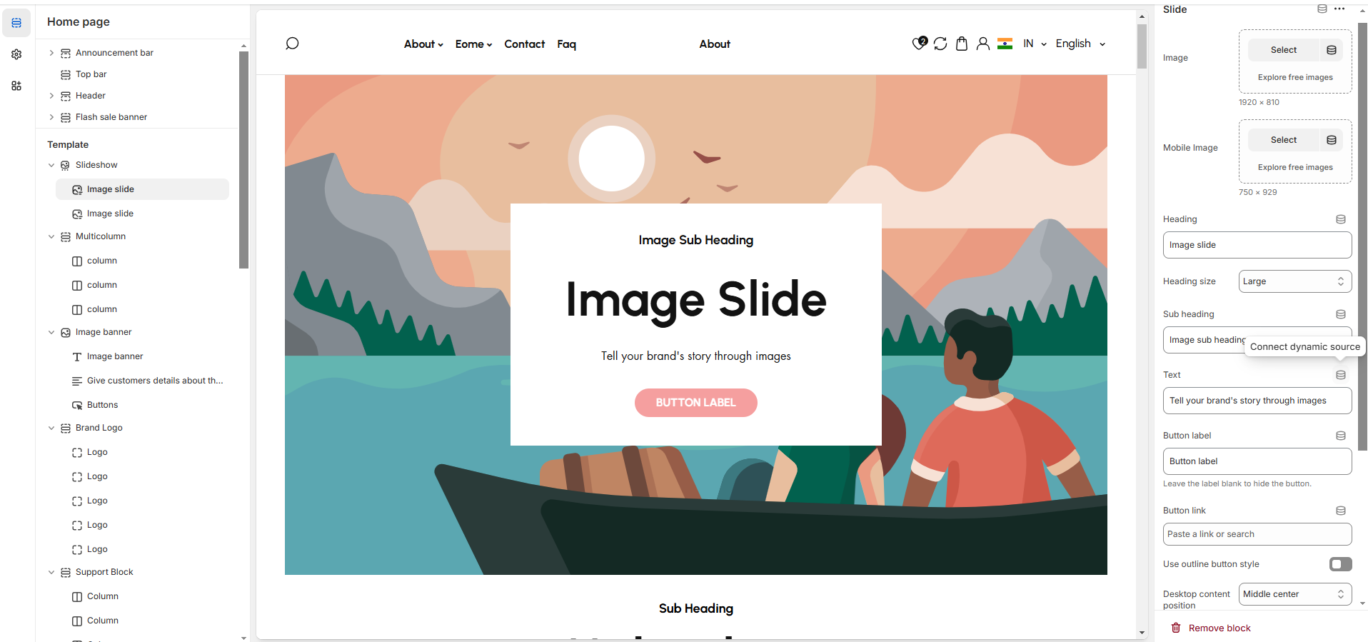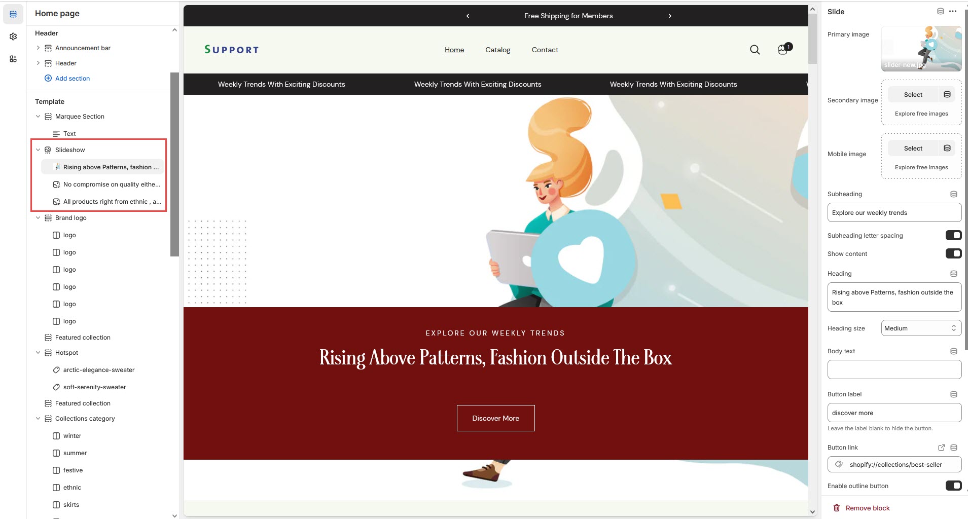 The **Slideshow Section** allows you to display multiple images or banners in a rotating format, making it ideal for highlighting promotions, featured products, or key brand messages.