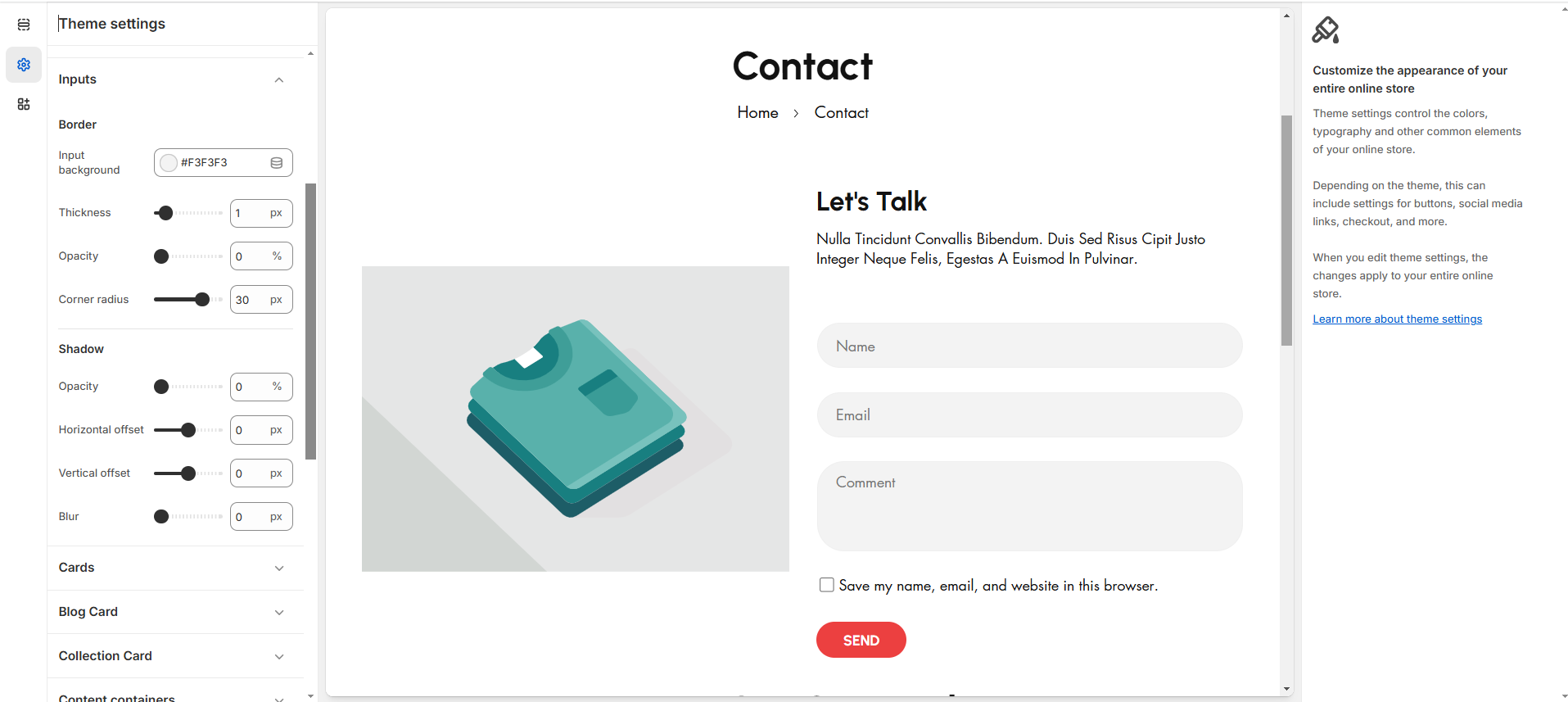 In Shopify, Input Settings refer to customizing forms and input fields such as contact forms, search bars, login forms, and checkout fields.