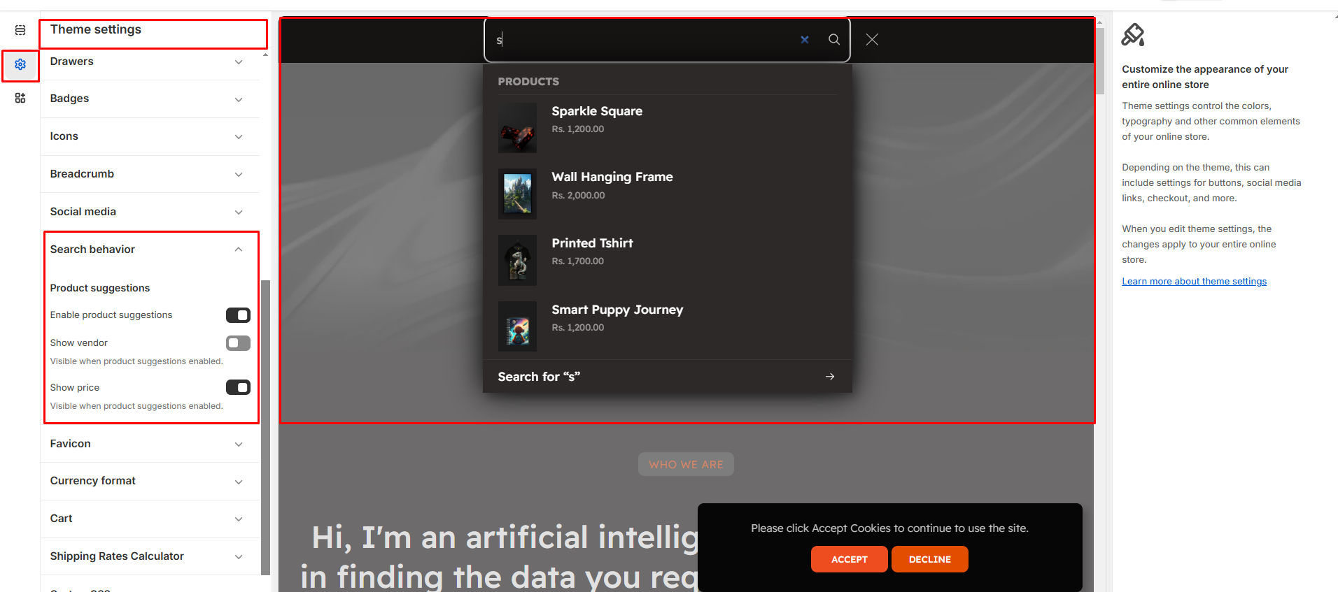 * **Enable product suggestions:** When the toggle is enabled, product suggestions will appear as users type in the search bar.